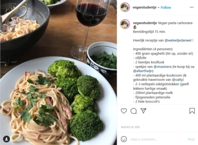 Op mijn Instagram deel ik deze recepten en nog veel meer. Ik vind het leuk als mensen mijn recepten proberen en mij vragen stellen. Instagram voelt als een soort community. Ik klets veel met m’n volgers en ik zie mensen op elkaar reageren, wat een saamhorigheidsgevoel geeft. Ook al heb ik overdag in Rotterdam niemand die vegan is, als ik dan m’n telefoon open denk ik “Ohja, het is hartstikke normaal om vegan te zijn, want mijn hele feed staat alleen maar vol met andere vegans”. Voorheen kon ik me soms best een beetje een alien voelen en denken: “Ben ik nou gek?”. Maar door Instagram heb ik gelijkgestemden leren kennen waarmee ik al snel het gevoel heb alsof ik bevriend met ze ben, omdat we over dit belangrijke onderwerp hetzelfde denken.